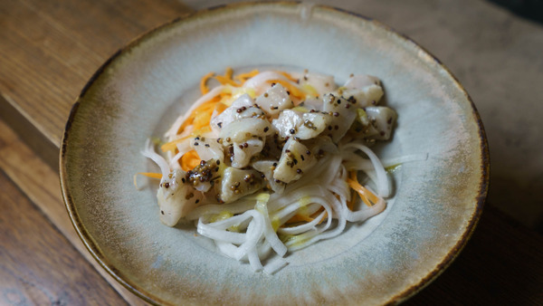 ライムジュースと粒マスタードでマリネして、大根と人参とで前菜に。