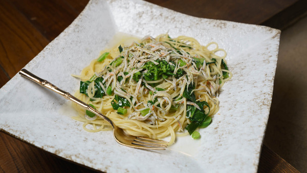 ブロッコリーの葉ときびなごの新子のペペロンチーニ。