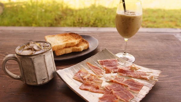 生ハム乗せ放題のハードトーストとアイスラテ。