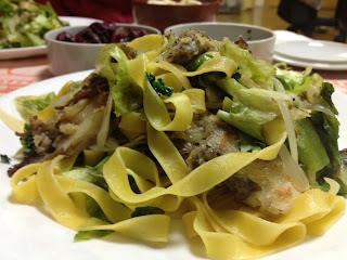 舞茸、レタス、玉ねぎ、パセリのパスタ。炒めたレタスに醤油が絶妙です。