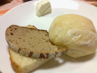 ほうれんそうカレー、パニールではなくナチュラル・フレッシュ・チーズ。パン、ミルク・ティー。