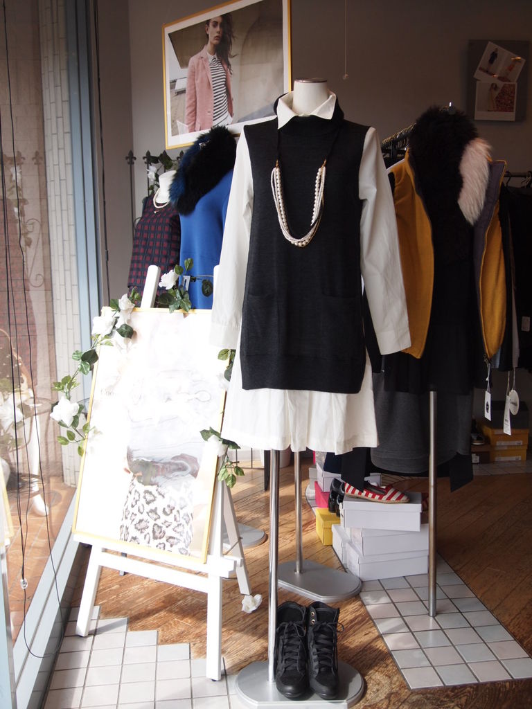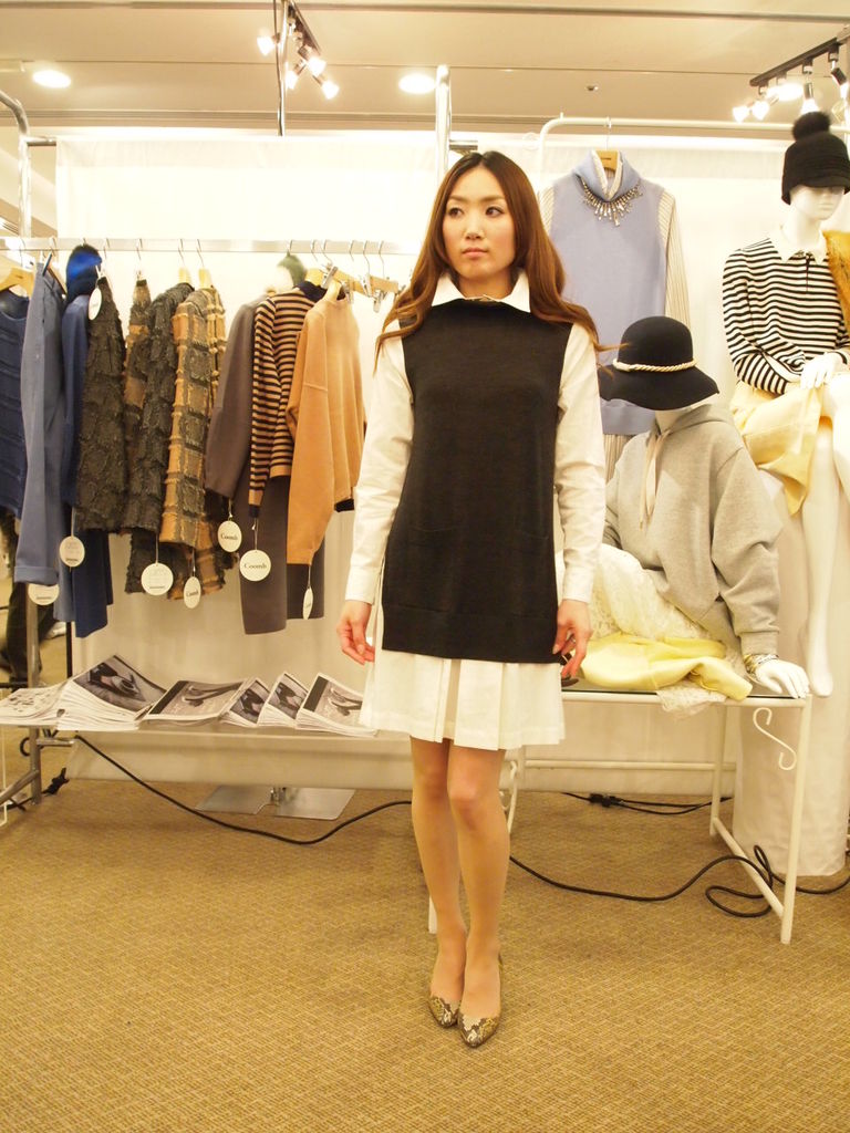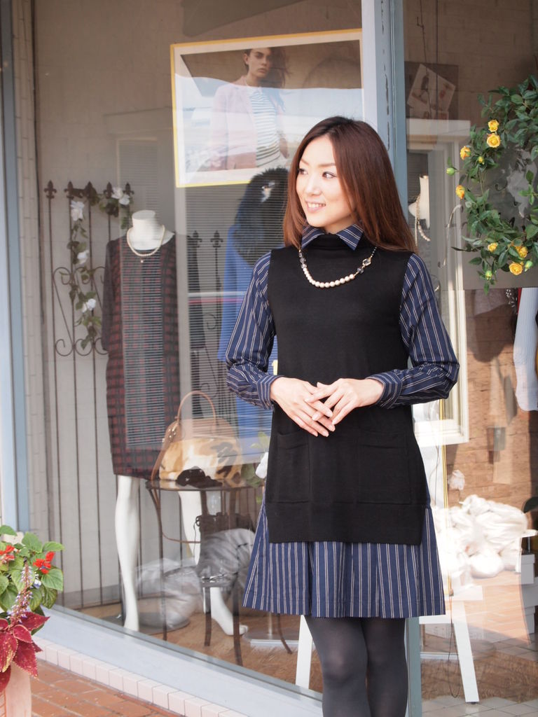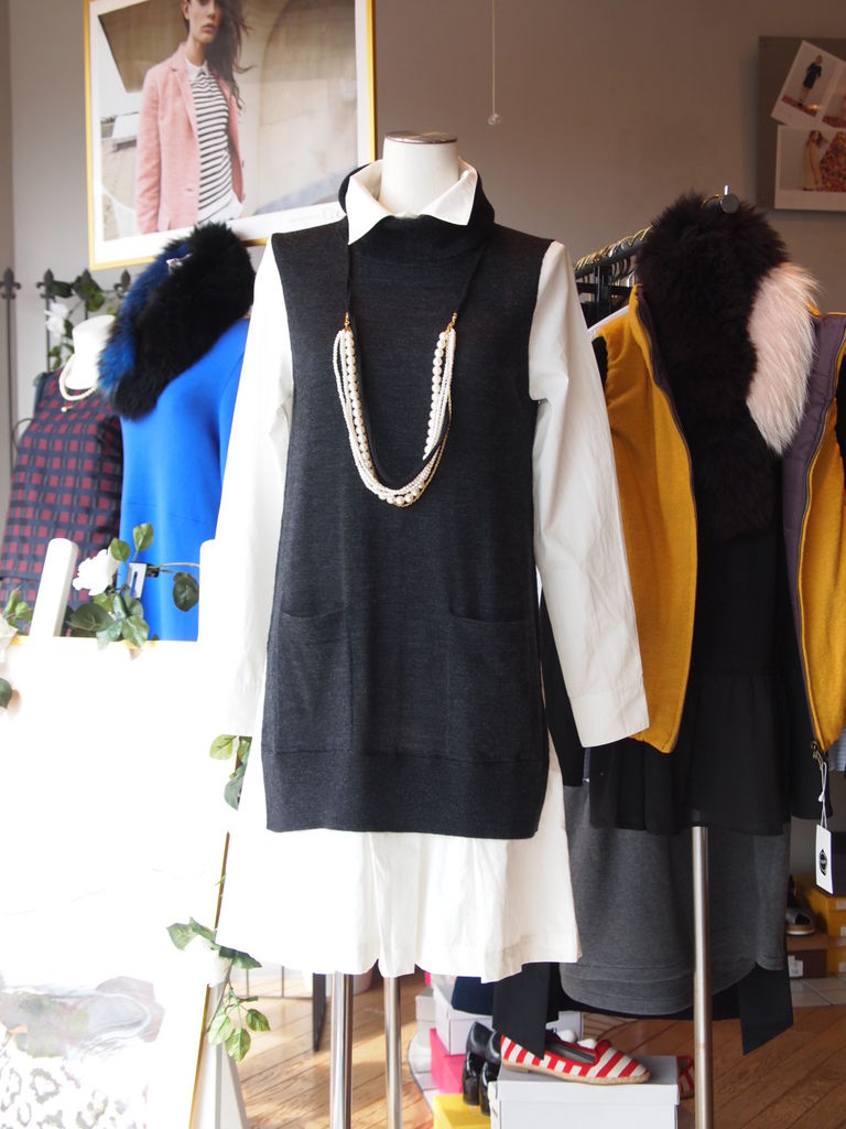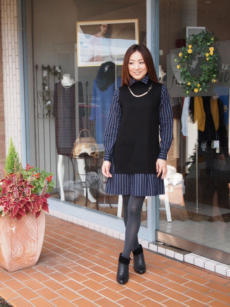 可愛いシャツワンピーの上からニットジレを重ね着したドッキングワンピーです