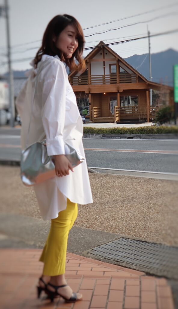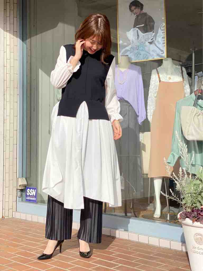 とろみのあるロングシャツにニットベストを重ねているようにみえる