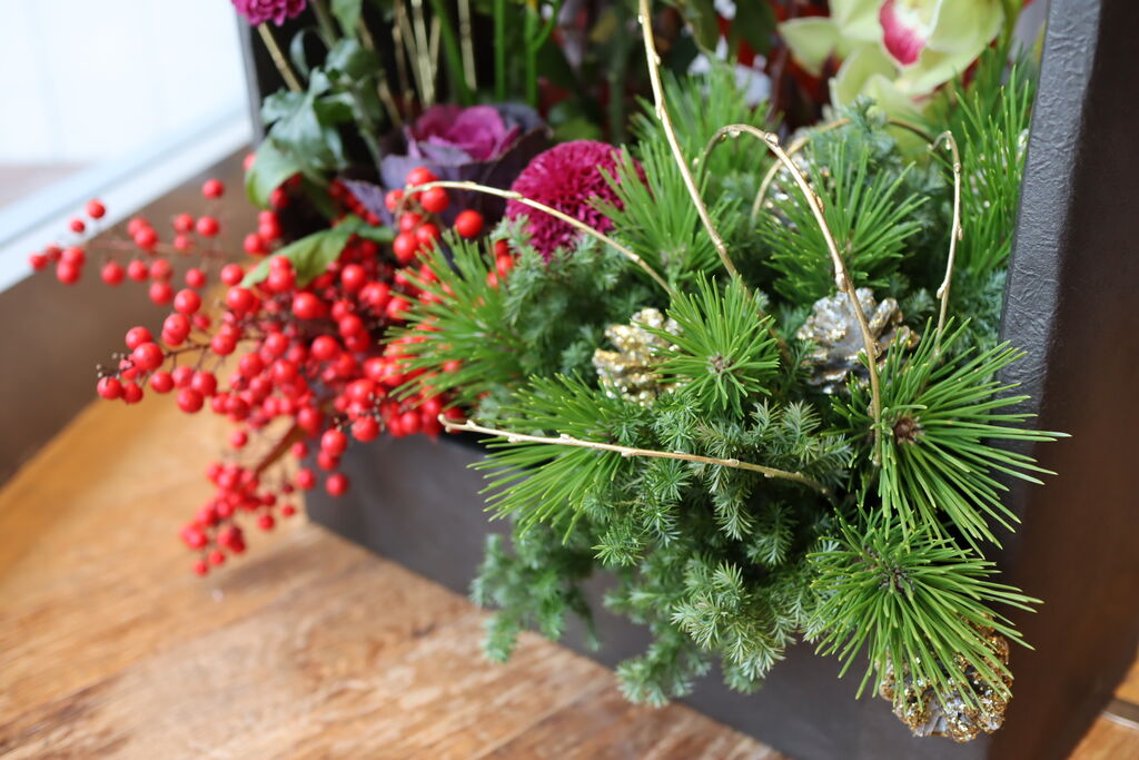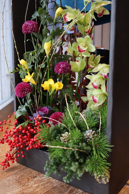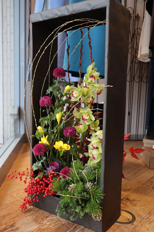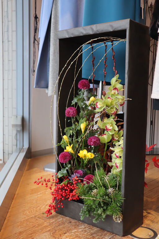 ウィンドーに華やかなお正月のお花が入りました。
