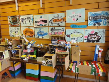壁には園児たちの絵や工作がたくさん展示してあります。